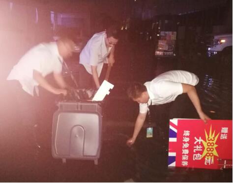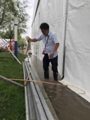 其中李鵬、宋燚 、劉宇飛、趙黎達等員工天還沒有亮,拿著手電筒帶著排水工具趟過淹沒膝蓋的積水,通過疏通下水道井蓋排水、開啟室外展館圍擋通風(fēng)、抽水機抽水等方法而忙碌著,只為確保展會活動工作有序進行。