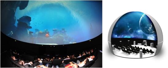 直徑10米,高7米,360°球幕影院,進去之后將你帶入星星云團背后,一瞬間畫面又被拉近到另一座星球,星球表面氣流活潑地流動,地面上隨著火山爆發,火紅的煙氣騰空而起。如同發生在眼前,不用戴3D眼鏡也能感受3D效果。
