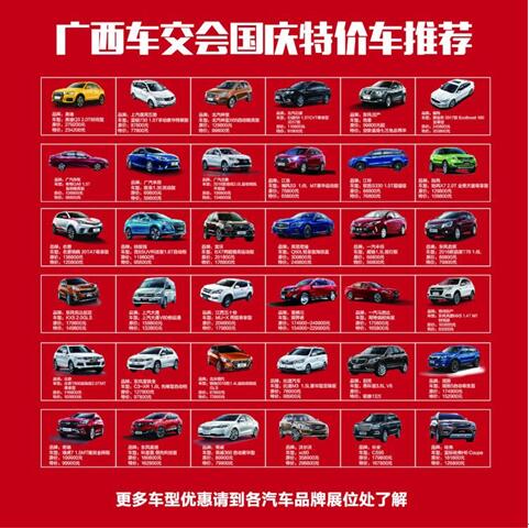 本屆廣西車交會得到汽車廠家、4S店大力支持,攜手眾多品牌參展,如保時捷、阿爾法·羅密歐、林肯、奔馳、寶馬、奧迪、路虎、英菲尼迪、雷克薩斯、沃爾沃、謳歌、進口大眾、道奇、進口豐田、Jeep、斯巴魯、WEY、上汽大眾、別克、雪佛蘭、斯柯達、一汽大眾、一汽豐田、一汽馬自達、廣汽豐田、廣汽本田、廣汽菲克、廣汽三菱、東風本田、東風日產(chǎn)、東風標致、東風雪鐵龍、東風悅達起亞、雷諾、福特、寶沃、北京現(xiàn)代、長安鈴木、野馬、比亞迪、觀致、奇瑞、吉利、廣汽傳祺、中國一汽、納智捷、東風風行、江鈴、江西五十鈴、鄭州日產(chǎn)、長安汽車、東風風光、MG、東風小康、啟辰、陸風、上汽大通、斯威、東風風神、江淮、長城哈弗、寶駿、漢騰、榮威、北汽紳寶、眾泰、比速汽車、北汽幻速(排名不分先后)等品牌,車型齊全,家轎、商務用車、SUV、頂級豪車等參展品牌悉數(shù)登場,價格區(qū)間也從幾萬到幾百萬不等,覆蓋了最廣泛人群的買車需要。