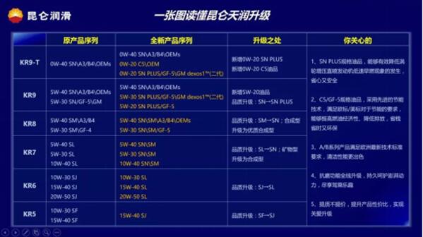 其中全新昆侖天潤KR9-T系列產品品質全面升級,同時新增0W-20低黏度級別產品。國內領先推出滿足歐洲最新節能環保ACEA C5標準要求的產品以及滿足API即將頒布的最新技術標準SN PLUS性能要求的產品,是出保后高端車車主和OEM裝車油的優選。