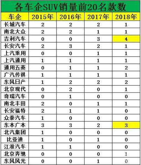 值得注意的是,在SUV銷量排行榜中,前20名中有4款車型來自同一品牌,這在中國汽車發展史上尚屬首次。縱觀整個汽車市場,在SUV市場增速較快的2015年、2016年,單一品牌SUV產品銷量能排進前20名的最多也僅有3款。現在吉利汽車創歷史達到了4款,也進一步印證了吉利SUV在市場上的領先地位。