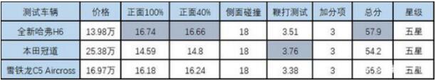 在新規(guī)C-NCAP碰撞測試中,全新哈弗H6以57.9分的總分,獲得五星安全認證,其中100%正面碰撞、40%正面偏置碰撞這兩項最能反映車身結(jié)構(gòu)安全性的測試中,全新哈弗H6分別獲得16.74分、16.66分的高分,超過了本田冠道、雪鐵龍C5等合資品牌。