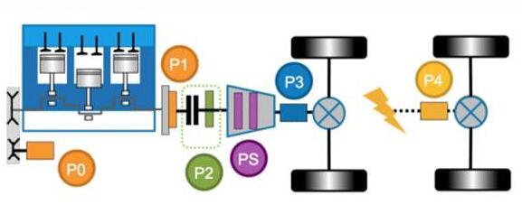 這個平臺最大的特點是采用了P0+P4的獨特架構,那么問題來了,什么是P0?又什么是P4呢?其實這個問題很容易理解,在混合動力技術的領域里,按照電動機相對于發動機的相對位置,分為了從P0到P4的五種架構以及功率分流式的PS架構。