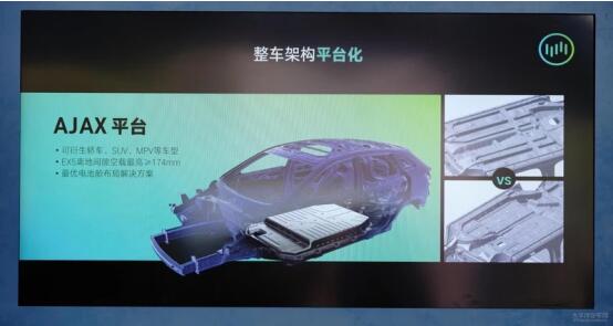 整車方面為純電動車型專用的AJAX平臺,專用平臺最大好處就是優化電池倉的布局,提升空間利用率。