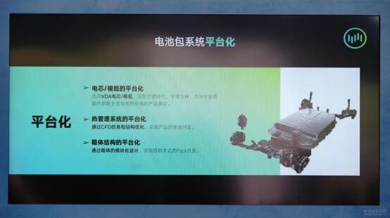 電池方面的亮點同樣是電池包的平臺化,通過電芯模組、熱管理系統、箱體結構的平臺化,來實現不同電量的快速開發。