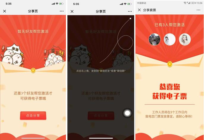 3、報名之后跳轉到分享頁面,點擊右上角,分享給三個好友幫您激活才可獲得電子票。