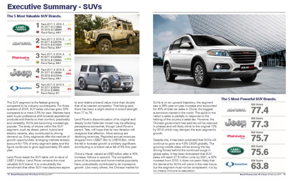 2017年,在國際著名品牌評估機構Brand Finance發布的“2017全球專業SUV品牌力”排名中,哈弗品牌力超越其他自主品牌及眾多合資品牌,品牌等級AA+。在“中國SUV品牌強度”排名中,哈弗力壓群雄。