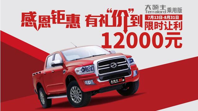 不久前,領(lǐng)主商務(wù)版推出交1000抵6000的優(yōu)惠政策,受到用戶群體的好評搶購。7月,中興汽車重磅出擊,又推出“感恩鉅惠 有禮‘價’到——領(lǐng)主乘用版限時讓利12000元”的空前鉅惠,為高端皮卡消費(fèi)者帶來更大福利。據(jù)了解,本次活動時間為2018年7月11日至8月31日,凡購買領(lǐng)主乘用版的用戶均可享受12000元的超大讓利。這份超值的讓利大禮中,包括8000元的現(xiàn)金直降、價值2000元的商業(yè)保險包以及價值2000元的裝飾大禮包。有購買意向的用戶還要盡快到店咨詢,盡享超值鉅惠。