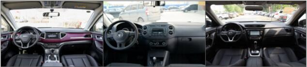 在外觀方面,新哈弗H6 Coupe紅標版的前臉采用六邊形的大嘴進氣格柵,搭配造型犀利的大燈,霸氣十足。車身側面采用流行的高腰線設計,搭配19寸輪轂,頗具運動范兒。新途觀的外觀響應了大眾家族一貫的作風——“穩”,進氣格柵和大燈貫穿整個前臉,整體是四平八穩的感覺,但略顯老氣。新奇駿的前臉采用日產家族V-Motion設計,前臉大V字造型搭配寬大的鍍鉻飾條,進氣格柵與兩側大燈相連,整體呈上揚趨勢,具有較強視覺沖擊力,而車身和尾部則相對更加簡潔。當然,一款車的外觀審美是個比較主觀性的東西,正中下懷就好。此外,值得注意的是新哈弗H6 Coupe的遠近光燈都是LED大燈;途觀的遠近光燈是采用的氙氣大燈;而奇駿依然采用的是鹵素大燈,這在20萬級別的車上讓人感覺不夠大氣。
