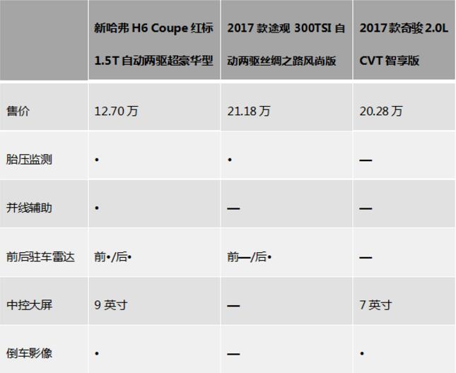 雖說新哈弗H6 Coupe的價格區間在12萬元左右,和新途觀及新奇駿20萬元左右的售價完全是不同的級別,但在產品力上卻顯得“足智多謀”,針對于三車的詳細對比,我們不妨一起去看看。