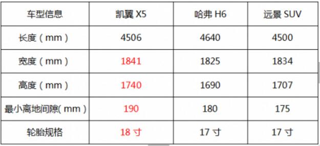 在車身尺寸上,三款車型中,哈弗H6最長,達到4640mm,但在寬度和高度上,凱翼X5均占優勢。而且在體現SUV特性的最小離地間隙與輪轂大小方面,凱翼X5也超出了競爭對手,190mm的最小離地間隙與18寸輪轂凸顯了良好的越野性能。190mm的超高通過性和600mm的強大涉水深度使得凱翼X5即使面對雨季時的積水路段也毫不畏懼。