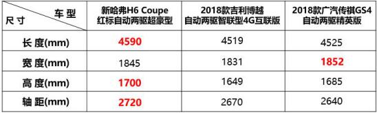 既然是同價位同級別對比,那么大空間、長軸距的那一款,顯然更受消費者青睞。三款對比車型在長寬高及軸距方面,誰勝誰負一目了然:新哈弗H6 Coupe紅標自動兩驅(qū)超豪型車長4590mm、寬1845mm、高1700mm,2018款吉利博越自動兩驅(qū)智聯(lián)型4G互聯(lián)版車長4519mm、寬1831mm、高1694mm,而2018款廣汽傳祺GS4自動兩驅(qū)精英版車長4525mm、寬1852mm、高1685mm,其中在車長、車高兩項尺寸指標中,新哈弗H6 Coupe均占據(jù)優(yōu)勢,而車寬也只是比傳祺GS4少了微不足道的7mm而已。在軸距方面,新哈弗H6 Coupe也是三車中最長的,達2720mm,分別比吉利博越、傳祺GS4長出50mm和80mm。