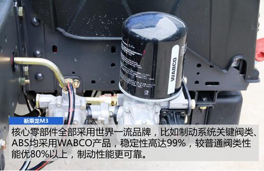 這款新乘龍M3的核心零部件全部采用世界一流品牌,比如制動系統關鍵閥類、ABS均采用WABCO產品,穩定性高達99%,較普通閥類性能優80%以上,制動性能更可靠。卡友們還可選配前盤式制動器(也可選全車盤式制動器),抗熱衰退性好,機械制動效能和穩定性大大提升,卡友們可盡享世界一流品質的保障。