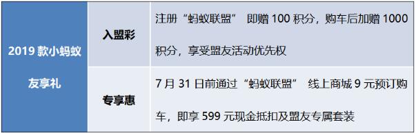 據了解,本次2019款小螞蟻購車友享禮包含“入盟彩”和“專享惠”兩重禮遇,即日起用戶通過其官方微信小程序““螞蟻聯盟線上溝通平臺””注冊“螞蟻聯盟”會員,即獲贈100積分,成功購車后還會再享1000積分,并享受更多會員專屬活動優先權;同時7月31日前,用戶登錄螞蟻聯盟” 線上商城,還可在線參與9元預訂購車的專屬優惠活動,并享受599元現金抵扣及盟友專屬套裝好禮,表現出了小螞蟻滿滿的誠意。