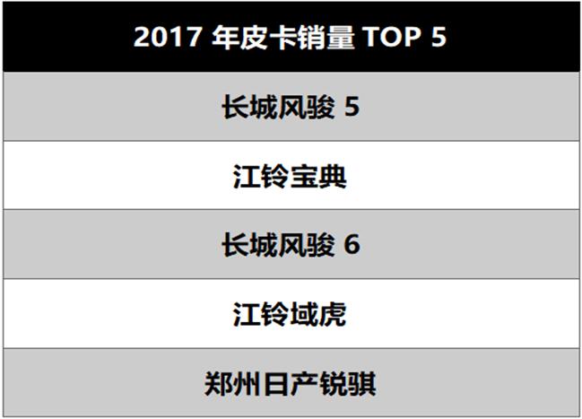 其實(shí),盡管皮卡一直被區(qū)別對(duì)待,但因?yàn)樾枨箝L(zhǎng)期存在,國(guó)內(nèi)皮卡市場(chǎng)一直在低調(diào)進(jìn)化。拋開皮卡的行業(yè)性需求,家用需求也在隨著消費(fèi)升級(jí)、自駕出游等生活方式的改變逐漸露出苗頭。從2017年銷量排名里,我們也能大概看出皮卡市場(chǎng)的發(fā)展趨勢(shì)。